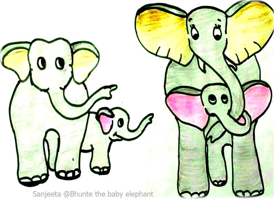 Bhunte’s mom told Bhunte about her cousin sister in Africa. Bhunte did not know that his aunt was taller than his mom, and had a pair of tusks, her head was a single dome with bigger flapping ears and her trunk had two tips. Her back was slightly dipped than Bhunte’s mother who had an arched backbone. He was also overwhelmed to know about Baako, his aunt’s son. Bhunte had five toes in his forelegs and four in his hind legs. And Baako had four toes in his forelegs and three in his hind legs. Bhunte’s ears did not cover the shoulder, while Baako’s big ears touched his shoulder! Bhunte was glad to know how different Bhunte was from Baako. He asked his mom if he could go and meet him. His mom laughed and said, “Bhunte, she lives far from here, and we shouldn’t cross those firing wires…”. His mom pushed him in. But, Bhunte was still thinking about meeting Baako.