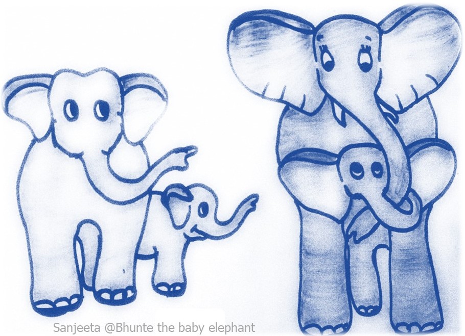 Bhunte’s mom told Bhunte about her cousin sister in Africa. Bhunte did not know that his aunt was taller than his mom, and had a pair of tusks, her head was a single dome with bigger flapping ears and her trunk had two tips. Her back was slightly dipped than Bhunte’s mother who had an arched backbone. He was also overwhelmed to know about Baako, his aunt’s son. Bhunte had five toes in his forelegs and four in his hind legs. And Baako had four toes in his forelegs and three in his hind legs. Bhunte’s ears did not cover the shoulder, while Baako’s big ears touched his shoulder! Bhunte was glad to know how different Bhunte was from Baako. He asked his mom if he could go and meet him. His mom laughed and said, “Bhunte, she lives far from here, and we shouldn’t cross those firing wires…”. His mom pushed him in. But, Bhunte was still thinking about meeting Baako.