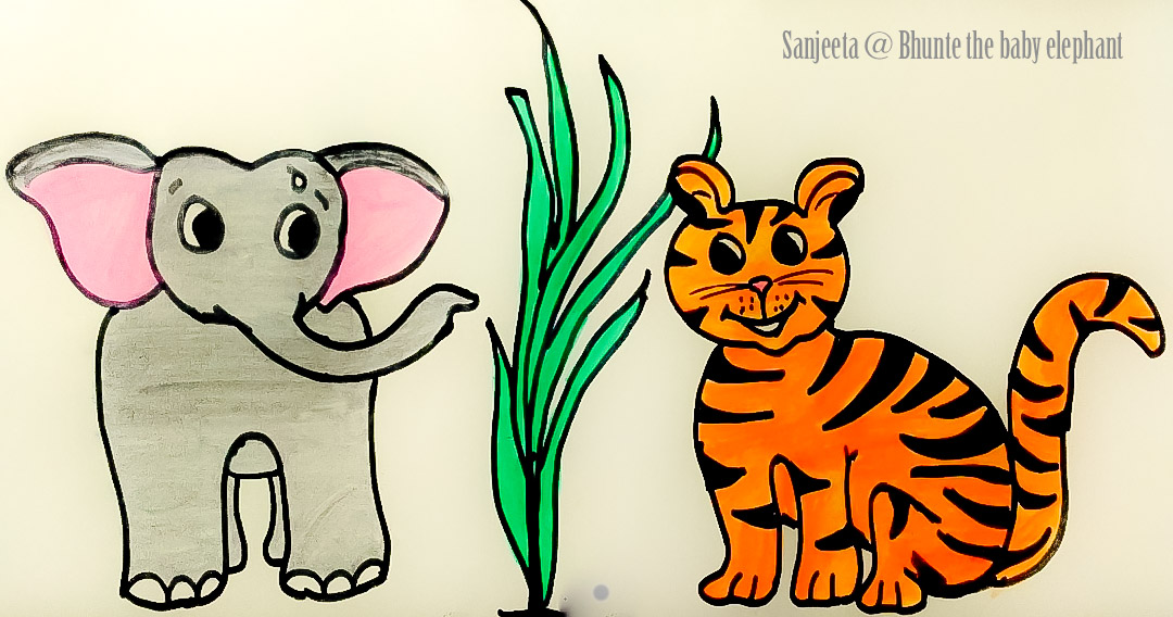 Bhunte has a habit of strolling when his herd is engrossed in grazing. He had encountered many wonderful animals during this exploration. Today too was such day. He heard the alarm calls from Bonnet macaques and Spotted deer. His herd warned him to come back. But, he was curious. He saw animals running away from that bush. He walked towards it- very cautiously. When he was tiptoeing, he noticed some movement next to him. Someone was shaking the tall grasses. He carefully peeped in- by pushing the grasses aside. Voila! a tiger! With his nerves- all frozen, he stood there still. He wished he never had such curiosity. He wanted to go back to his herd. Suddenly, a very cute voice broke down all his nervousness. “Boo! I am Pukule. Please do not get scared. My brothers are playing over there. And my mom is sleeping. I saw you coming towards us. So, ran up to you to greet you. You want to play with us?” Bhunte had never heard of such generous offer from a carnivore! A cute carnivore! Though, he wished to join Pukule and his brothers. He knew clearly that their ways of playing will certainly hurt him. Without even responding to Pukule’s request- he ran, he ran closing his eyes, with all his stored energy and with a determined thought to never come back to that spot. Smashed! He banged on something hard. He opened his eyes to find his mom. She seemed worried. She rubbed her trunk on his head and pulled him closer. “Bhunte, I told you to not to ignore any alarm calls in the forests. I am not instructing you to hate them. But always, respect them and remain aloof from their way. They too are in the sad state. They are being hunted for their bright skins. You are lucky that you met them. I wonder if you will see them again”. She pulled Bhunte by his trunk and started walking towards the herd. His aunts and sisters were desperately waiting for him. They trumpeted when they saw him safe with his mom. When he reached amongst the herd and they started marching towards the river, he turned back to see- Pukule. After hearing from his mom, he felt sad about Pukule. He wished to meet him again and prayed for the safety of Pukule and Pukule’s family…