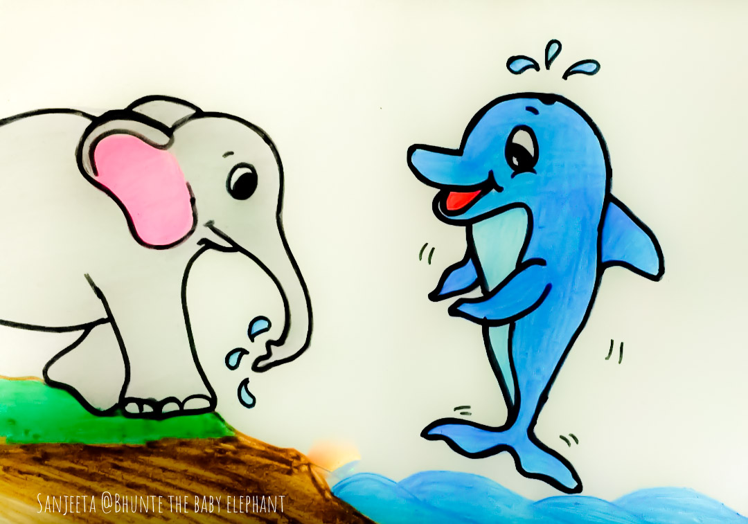 It was a mid-day. Bhunte’s herd was near the river bank. Everyone in the herd was lazily grazing. They were scrapping out the grasses with their front foot and smashing the grasses on another front foot to get rid of mud and dirt and then, were feeding on them. While Bhunte was dawdling around smelling dungs, shooing away Mynas and playing with his trunk, he felt thirsty and went to the nearby river. While he was drinking, he saw a large fellow somersaulting and splashing amidst the river. Bhunte was curious, again. This fellow with a snout and the soft shiny-coat came floating towards Bhunte and jumped again. Bhunte too got drenched with that splash. With a very friendly attitude, this fellow whistled and introduced himself- “Hellooo, my brother, I am Chantu. A river dolphin. I am very happy to meet you.” He whistled again. Bhunte too spread his ears and trumpeted and started randomly running and following his new friend- Chantu. Chantu used to dive in and whirl on the air and again- ‘Splassshhh’. Bhunte was so happy- he ran along the river bank, while Chantu floated swiftly. Chantu whistled and Bhunte trumpeted. The entire forests and river bank joyously relished a new symphony! However, both Bhunte and Chantu were unaware about the fate of their abodes and their existence. Many of Chantus get trapped in the fishing nets, embankments/ dams, and lose their lives. Over-exploitation and river-poisoning caused by booming populations of humans have risked their existence and survival. Known for their human-like personality and intelligence, dolphins are also called ‘non-human persons’. While Bhunte and Chantu were engrossed in enjoying their new friendship- their future hushed!