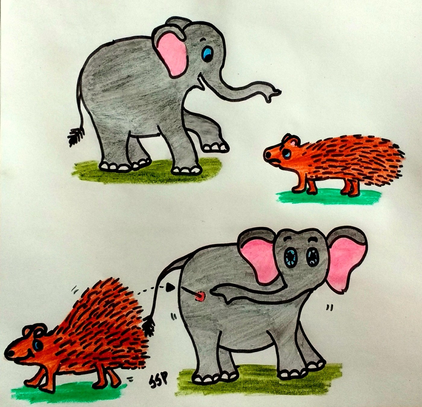Bhunte was in a jovial mood. He was swinging his trunk left and right as he was walking behind his mom. Like always, he got distracted again- when he saw a little cute animal walking on his trail. He stopped to sniff and observe. Well- this little fellow was very busy to even pass him his ‘hi’. Bhunte walked right in front. “Hey there, who are you and where you heading to?” Bhunte trumpeted. “Well, I am Punte and I am very busy- kindly walk away from my way!” Bhunte found him funny and started giggling at him. Punte got annoyed. “Oh, you need a side? My little Punte!” Bhunte laughed. Punte could not control his anger- and hence walked away. Out of the blue- came a very sharp spine! Right into the butt of Bhunte! “Ouch” Bhunte yelled!