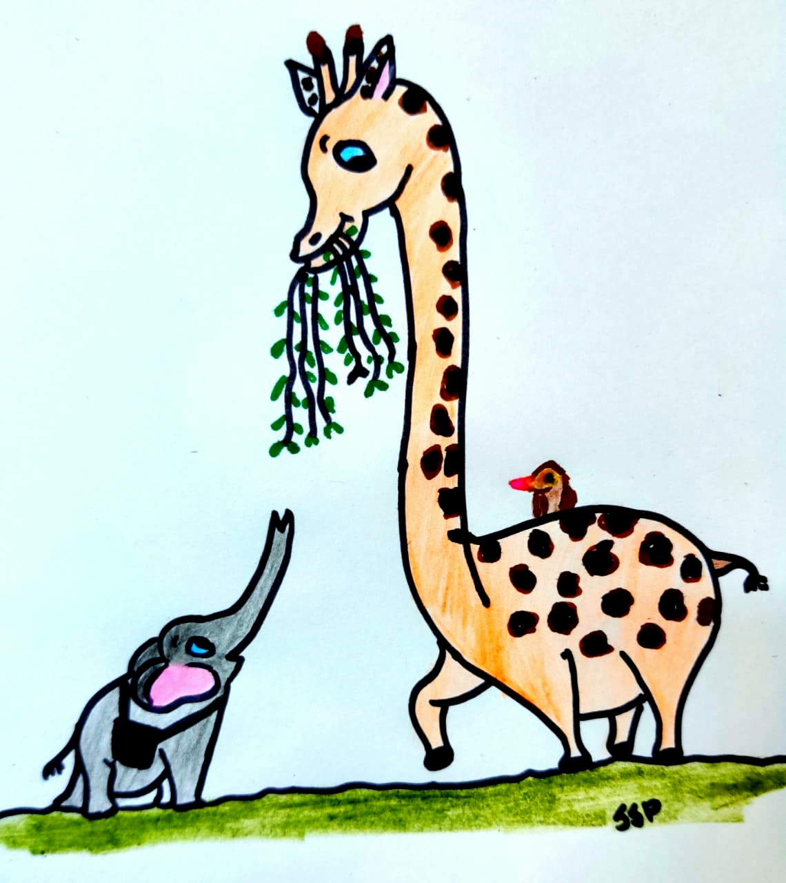 Bhunte was very excited. This was his first trip to the place, Africa, where his ancestors originated. He packed his bags and started his journey. He travelled to Addis Ababa and to Kruger, the forest where he hoped to meet Bako’s relatives. As he was marching boldly in the dry forest of Kruger, he bumped into the tall bamboo-like legs, Bhunte was scared. He slowly stretched his head up and whoa! he saw a smiling Giraffe. “Hey fella, you seem new to my place, by the way, I am Lambu. Where you from?” And a little chirp from his back “Lambu, who’s this guy?” A tiny bird with a red beak perched on the back of Lambu. Bhunte with a slight tremble- trumpeted “Hi and namaste, I am Bhunte, I came from the Asian forest, wanted to meet Bako’s relatives. But, I am glad that I met you, Lambu and what’s your name birdie?” Bhunte stretched his trunk towards the bird and smelt. “Well, I am Chari, an oxpecker, I help Lambu relax by eating the delicious ticks on his body”. She flew and sat on Bhunte’s head and started looking for the treats. Bhunte got tickled and started rolling on the ground. All of them laughed…Lambu and Chari became his best friends and they took him around Kruger.
