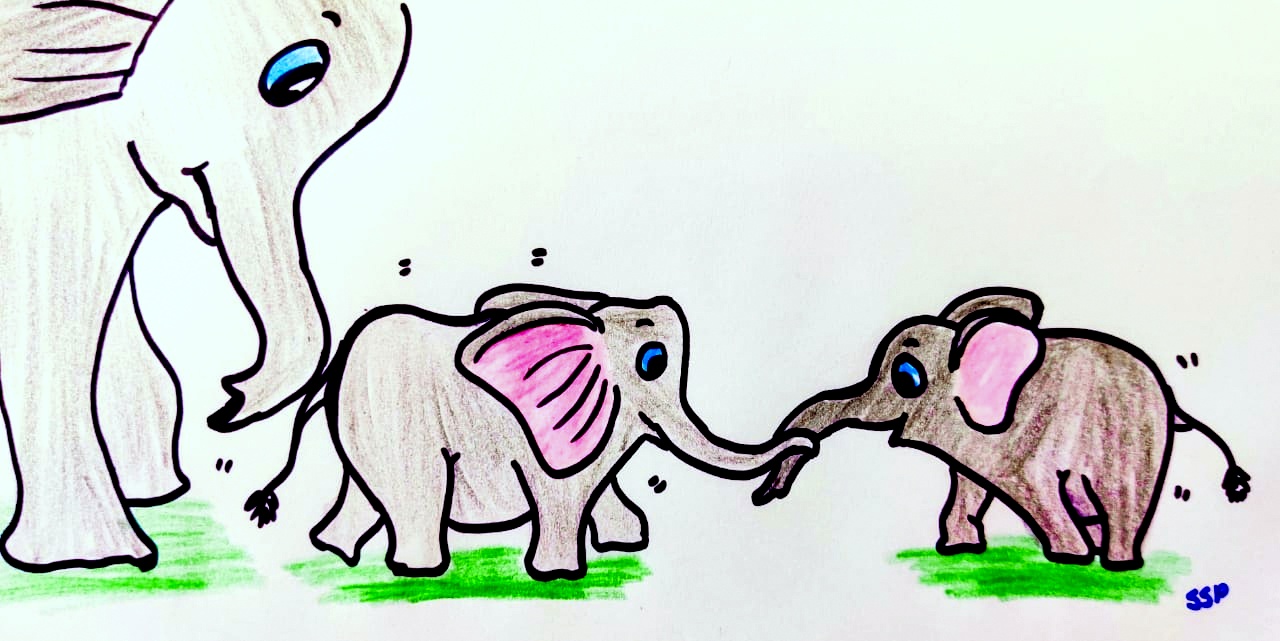 “Mom, meet my new friend- Bhunte” she trumpeted. “Welkom, dear Bhunte”, said her mom. Bhunte was very happy. He raised his tail and ran towards them. Amaka’s mom was very very tall than Bhunte’s mom. They sniffed Bhunte and he slowly rubbed his body against Amaka’s mother forelegs. They were happy to have Bhunte as a guest.
