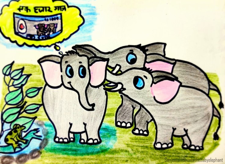 Bhunte met the twin elephants- Ram Gaj and Lakshman Gaj of Chitwan National Park when he went with his herd to Nepal through the North West Bengal forest. Rama and Lakshman rolled their trunks on Bhunte’s hair. They were excited to meet their tiny brother, Bhunte. Bhunte too was happy to meet them and paid his regards to them and Devi Kali aunt. Rama and Lakshman were born on the 6th of November, 2008. “Bhunte bhai, you must be happy to see us? Hami ta juduwa! (we are twins) and twins in elephants are rare to see as in many cases in the wild, we succumb to death or we may not be able to be identified as the twins as we will be in groups. But here in Chitwan, people saw our birth. There are a few more twin calves in Sri Lanka.” Both of them trumpeted. Bhunte was glad to know about the rarity of twins in elephants. He shook his head and trunk. A tiny frog, Bhyagutte, croaked and jumped. “Ani dajju, tapai haru ta Nepali paisa ma aaune re ho? ( So, you both will be featured in Nepali currency?)”-Bhunte expressed his joy. “Ho bhai, hami dui nai hunchau, hajar rupiya ma” (yes brother, both of us will be there in Nepali Rupaiya One thousand currency)-both of them trumpeted. Bhunte did not know what the currency will help them in? But, he was happy for Ram and Lakshman dajju as they are the cutest brothers, he ever came across with. He quickly bid them bye and disappeared in the forest of Chitwan, while Ram and Lakshman got back into their play, tossing their trunks against each other…while Bhyagutte jumped back to the twig and croaked again…