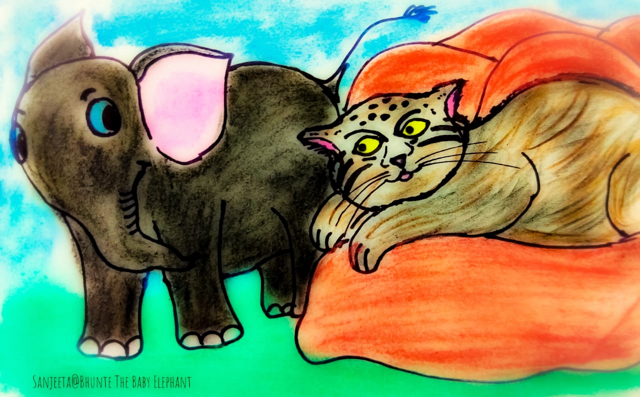 Bhunte was extremely tired after a day-long walk with mom and play with others in his herd. Tired Bhunte went next to his mom and sat down next to her hind legs and fell asleep. In the dream, he saw climbing the hills, rocks, and meadows. His tiny trunk kept obstructing him in his venture. He tried to pull it up. While doing so, he stumbled over and dashed the rock. His trunk touched something very soft and furry. ‘Ouch! I was ambushing to attack that pika!’ yelped a small-cat like creature with a very prominent set of aggressive eyes with a round black pupil. Bhunte saw a tiny pika jumping and running away from the site. ‘I am sorry, I was trying to adjust my trunk. Who are you?’ The lone furry friend was almost unnoticeable amidst the rocks, only his yellow eyes sparkled. Cleaning his fur, he said ‘I am Tashi. People call me Pallas’s cat. I love rocks and crevices. This provides me the best place to hide, rest, and attack my food. My furry jacket is thick and it gives others the illusion that I am big. It also changes its color with changing seasons, isn’t it cool?’ Tashi smirked. ‘I and my colleagues (as I prefer staying alone and maintain distance by marking my area) are fond of rocks and grassland. We love being here. Bhunte, by the way, I am not a good runner. But trust me, I can produce different kinds of calls and ambush my prey on their way’ Tashi was a cool cat, Bhunte thought. His eyes were wide and bright. ‘But very few people know about us. Our favorite sites are destroyed by humans and some of us are even killed for our fur.’ Tashi appeared sad. He silently went inside the crevice, without saying a ‘bye’. Bhunte felt sad too. But, for some reason, his trunk was hurting and he tried to adjust it again. When he pulled it harder, ‘Sorry Bhunte, my leg stepped your trunk, I was watching you and I dozed off.’ Bhunte’s mom gently trumpeted. Bhunte was surprised. It was a dream? He saw Tashi in a dream? Bhunte could not understand, but he wished to go to those steep rocky mountains to meet Tashi and to play with him…