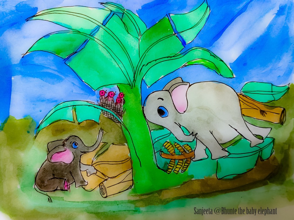 Chellakutty is now the hero amongst all the elephants in Tamil Nadu. He met Bhunte too and you should see those sparks Bhunte had in his eyes when he saw Chellakutty. Bhunte happily trumpeted and asked Chellakutty to share the illustrious story! Chellakutty dusted off his body and rubbed his skin against the bark of Tectona and ignored Bhunte’s request! That made Bhunte go impatient! Bhunte started walking behind Chellakutty and kept on nagging him by pulling his tail. So finally, Chellakutty rested against a huge Ficus tree and started. “Well, my boy, Banana attracts me. I can’t resist the smell of Banana. Yum, they are!” Chellakutty kept his trunk in his mouth. Bhunte never tasted Banana as it is not his usual food, so could not relate to what Chellakutty must have had in his mind. Chellakutty is among the bulls who secretly venture into human land at night. “That night I accompanied some of my friends. Five of us. We went to the nearby Banana farm. We started munching on almost 300 of the plants. Then I heard some chirps. It was from the Banana plant I was about to crush with my head.” Bhunte could see fear in the eyes of Chellakutty. “When I went closer and inspected, those were newly hatched babies. ‘Hey folks, I am sorry, I disturbed you, please kindly rest.’ that is what I said to those sparrow’s nestlings. A mother sparrow was a little grumpy and she kept on staring at me and chirped louder. So I gently retreated and left”. I also took Thambi and other bulls away from that plant, even though that plant had yummy bananas hanging!” Bhunte was so mesmerized by the kind act of Chellakutty. Bhunte thought once he will grow old like Chellakutty, he too will save many of his tiny friends. While Bhunte was pondering, a tiny bee passed by Bhunte. “Buzzzzzzz, watch out your way my ele brother!” That bee buzzed and left. Bhunte was in his own world, least he cared…