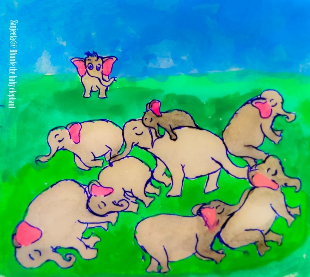 Wang Shu and his herd members are travelling through the cities from their home for a few months. Every human, wondering why Wang Shu’s herd is making such a long tour in their habitations, barely know that Wang Shu wanted to be in a new home and also meet his friend, Bhunte. It was Wang Shu’s grandmother who knew the route, which she remembered from her journey with her grand-mom 40 to 50 years back when she was of Wang Shu’s age. She started the journey, therefore. To her dismay, she found that there were no streams to cross and splash water, which she remembers playing with her tiny trunk when her grand-mom dragged her out of the water. No trees to tear up the branches to swat away the flies. She was completely perplexed when she found that there were concrete floors, lights, vehicles, houses, crowds, more concretes! She tried to search more. She guided her herd through these houses and cities, yet did not reach the forest. Wang Shu was tired and so were his cousins. Wang Shu’s grand-mom had no choice but to be back. On their way back to their old home, they rested. Wang Shu and his aunts fell asleep as they travelled almost 500 km. In his dream, Wang Shu saw Bhunte approaching him with his ears raised high and trumpeting towards him. He was excited. He woke up and climbed over his mother to get more sleep. Once Wang Shu will grow into an old Tusker, he will certainly start this journey again to meet his friend…