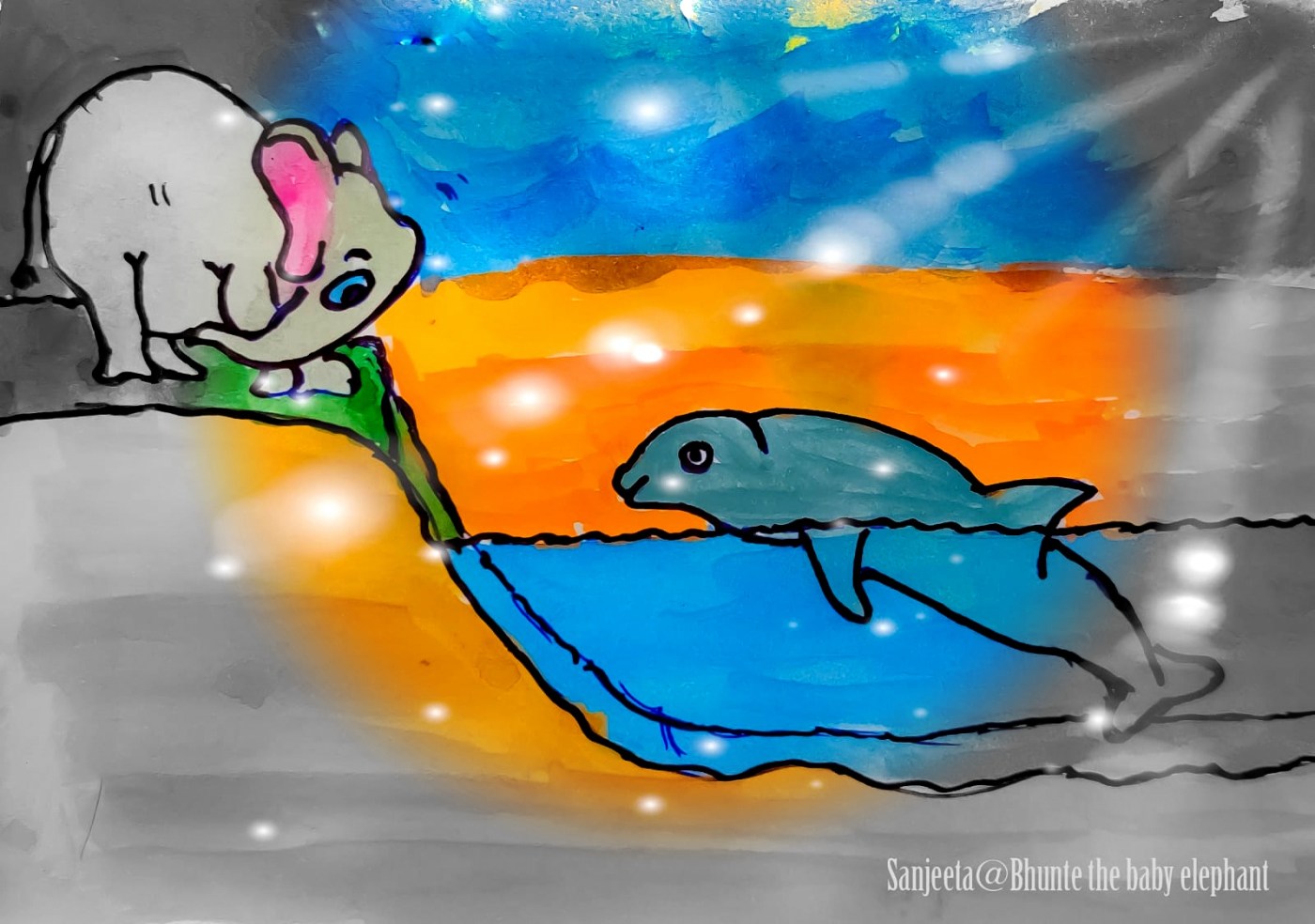 Little does Bhunte know about the vast world of sea and the enigma within. But, he heard from his distant uncle, Sailo dai, who often travels all around the forest and beyond, that there is a little sea cow ‘Vaquita’ porpoise. One of the little sea cows is Aba. A young vaquita, Aba, knows that their world is soon ending. It was disheartening to know that they are only 10 of them on this entire Earth! Bhunte was sad. He imagined how he would have travelled to the Gulf of California, Mexico to meet Aba. Even though, it would have been the largest distance travelled by the trunk-folks. Both Bhunte and Aba would have sat and shared the stories of their worlds till dusk. How painful it is to know that Aba and his remaining relatives will soon bid a bye to this earth. Because of overfishing, gillnets, meat trades and of course, humans spilling their toxic over the sea have taken a toll on these tiny bright-eyed, Vaquita. The smallest of cetaceans will soon be out of our biodiversity, it ached. Bhunte felt heartburns again…’ if not now, when shall these humans stop being cruel and caring about the majestic animals which are going extinct from this world for no reasons’. Bhunte did not feel like playing. He kept on imagining about Aba and his 9 last relatives.