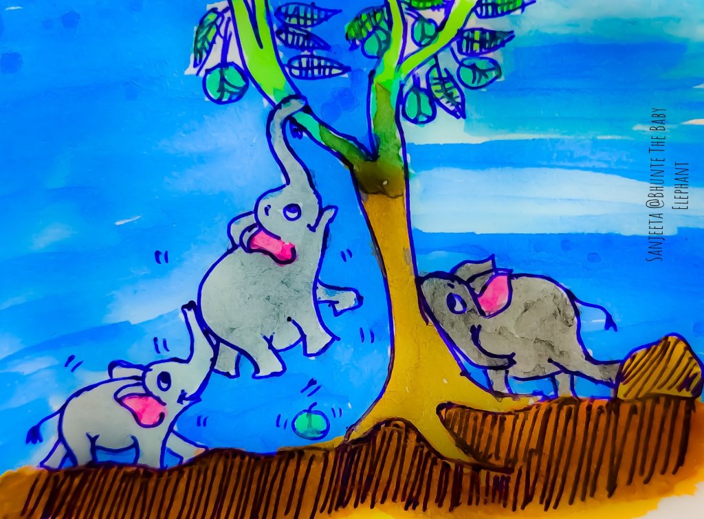 Well, I bet you have not seen an elephant hanging on a branch? Bhunte did. He himself was hanging! Bhunte, Punte and Dalli went around to see what mischievous things they could do that evening. And voila! they saw a tree of elephant apples (Dillenia indica). These are the favourite fruits that elephants love munching on and pooping the residuals! And why will Bhunte and his friends miss that chance??? Bhunte grabbed one low hanging branch and started shaking! The branch flew back to its original state, and a poor Bhunte was now hanging! But, he was loving this! Punte came from behind and gently pushed him and started running around out of joy to see his friend up in the air! While, Dalli was on her own mission to bring down the entire tree! And after all these tremors of tiny elephants, here fell down one elephant apple! Thud! on the ground! And another and another! What a joy! Bhunte, Punte and Dalli leaned against the tree and started happily munching…