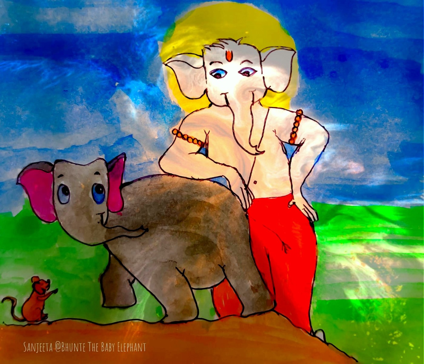 Dusk entered tip-toeing through the canopy of the forest. Bhunte was tired of all plays with his buddies. He trumpeted bye to all and walked towards his herd who were little away and foraging. When he crossed a mud hill, he saw a small rodent jumping in and out. He sniffed with his trunk and got curious. His tiredness vanished as he started closing the holes on the ground with one foot and another. He enjoyed this! He happily started closing one hole after another to catch the rodent. This tiny rodent too was enjoying the game and was making Bhunte more playful by peeping out of the hole where Bhunte could not reach. Bhunte started pushing the mud with his trunk. It was getting darker. Bhunte was engrossed in his game. He felt a gentle tap behind him and turned around to find an elephant-headed boy standing next to him. He got surprised. The boy had an aura and light all around him. “Bhunte, did you trouble my Musakraj?” the boy smiled and tapped Bhunte. Bhunte trumpeted “No, not at all, I was enjoying the game”. Bhunte came to know the name of a tiny rodent. “Musakraj”, he thought. “I have come to visit some of my folks, I will be here for 10 days, chant my name if you wish to meet me again. They call me Ganesha”. Bhunte was glad. He got two new friends again.