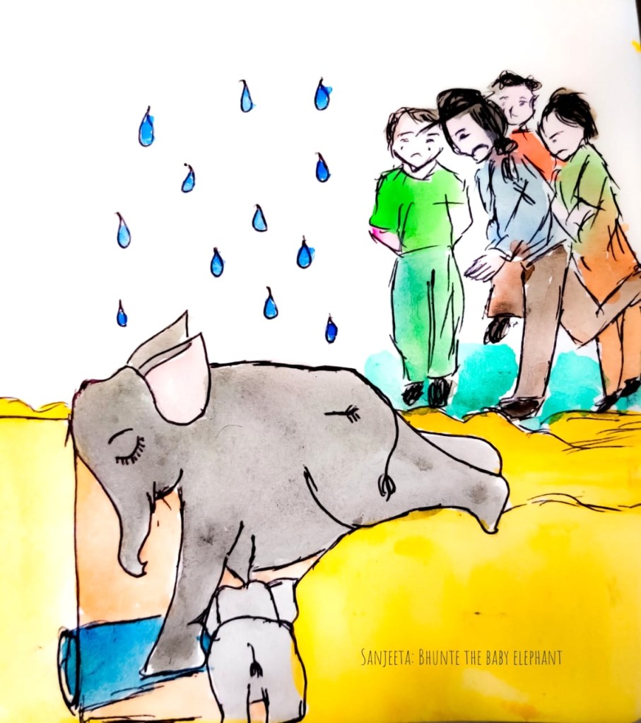 It has been quite some time since Bhunte and Sanu last ventured into the forest and made new acquaintances. Recently, Bhunte heard a distressing tale about his friend, Boon-mee, a young elephant residing in the forests of Thailand. During a heavy downpour, Boon-mee accidentally slipped into a pit and was unable to extricate himself. Despite his mother’s best efforts to rescue him, she was unable to do so.