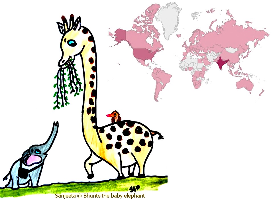 As a creator of Bhunte, I am so glad to see him reaching to the countries (above 106!) that I’ve never seen or will never reach. He will be back soon with his rendezvous with Stegodon. Till then keep reading his tiny stories of elephants, forests and beyond. Here I share one from his travel diary to Africa (where he met Lambu).
