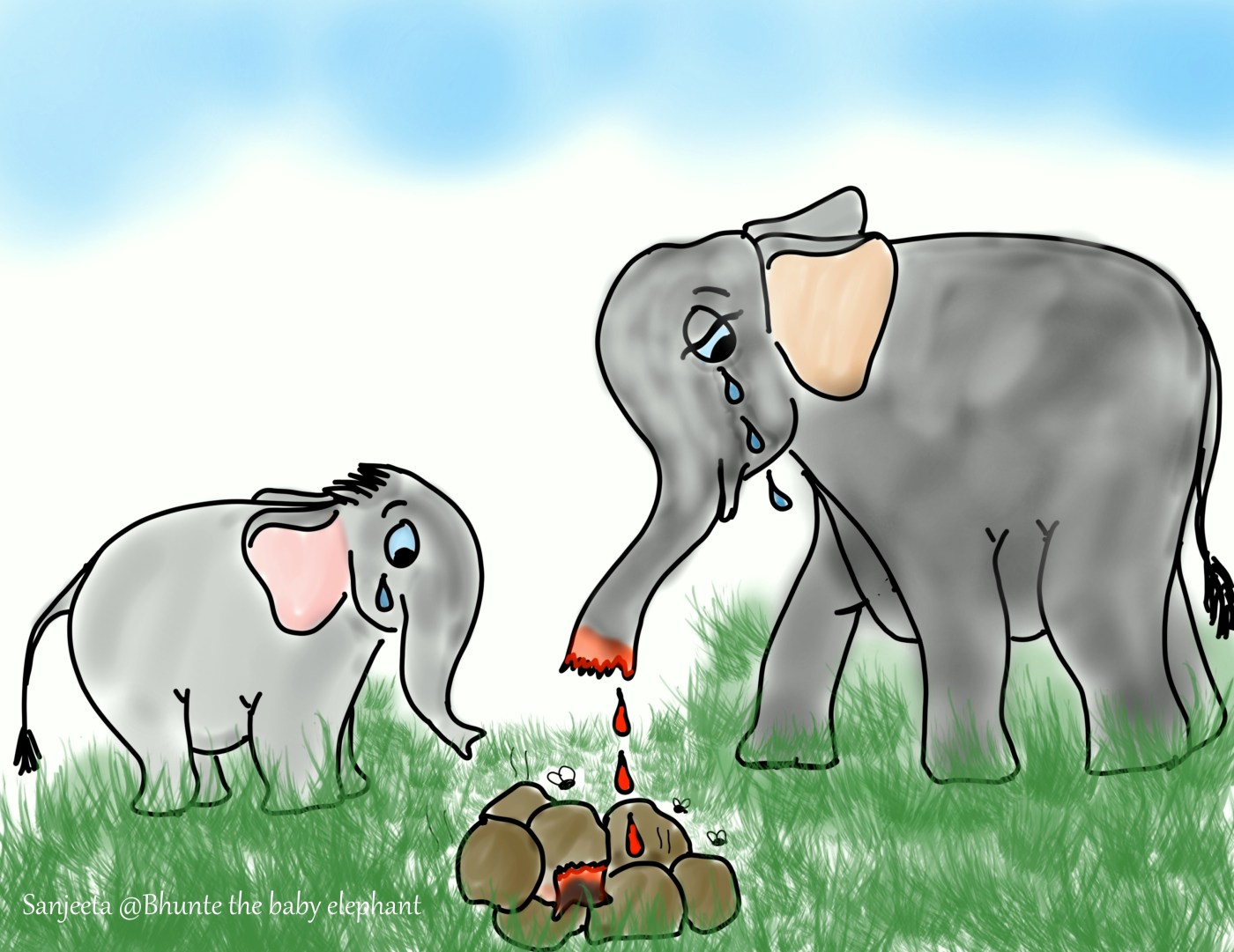 Bhunte was devasted to hear that his distant aunt, Chanchalkali’s trunk was chopped off by some unidentified people in Nepal. Chanchalkali aunt cried the whole night out of pain. The next day morning people found the chopped piece of her trunk near her dung! No one knows who might have hurt her and why! But, whoever did this, ruined her life! The life of an elephant! She was bleeding profusely! Bhunte knew that some of the humans are too harsh to deal with and have himself witnessed when his brother’s tusks were chopped off in December 2016. The trunk is a vital organ of elephants, these are synonymous with human hands and highly dextrous with thousands of muscles in them. With the help of a trunk, they can even pick up a tiny flower and pull down a mighty tree! A trunk can store gallons of water and can smell phenomenally with the help of thousands of olfactory receptors. In May 2017, Bhunte beautifully described what he can do with his trunk. Injuries to the trunk of elephants can lead to an agonizing death in wild elephants, while elephants which are under human care- have to be looked after for the rest of their lives- as they become completely dependent on purposes like drinking water and grasping food! Bhunte feels bereaved for his aunt, he wished he was there. He would have kicked those people and hit them with his trunk. Chanchalkali aunt has to eat what her mahout will feed her, she can drink only through a pipe or maybe not. She may also get the infection if not taken care of. It may also hinder her smelling ability. And of course, how will she trumpet!? Bhunte feels devastated after thinking of all these. He thinks this is a serious crime and whoever made her maimed should face the consequence, harsher than what they have done to her! Either by miracle or by surgery, if ever Chanchalkali gets back her trunk, Bhunte will splash the water, trumpet aloud and play around her the rest of his life!