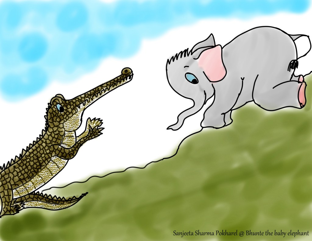 Bhunte is growing up and soon he will be a bull, staying away from his family. Surprisingly, he is still the same. Playful and mischievous. After playing with his sister, he ran towards the sandy bank of the Rapti. He thought of sliding down, rather than walking, after all, he is Bhunte! “Yooohooo!” he trumpeted as he slid to the bank. And there he met Babuwa, a very shy male gharial. When Babuwa saw Bhunte sliding towards him, he quickly turned around to go into the river. “Babuwa!, stop, I want to talk to you!” Bhunte trumpeted. Sighing and rolling his eyes, Babuwa was annoyed “What is it!”. “No nothing, I am just curious, last time I saw you- a year back- you had no that thing on your nose! What is that?”. Babuwa focused his eyes on his ‘ghara’ and explained “Well, Bhunte, I am a grown-up gharial now! Last time, I met Phoolkumari and tried to impress her with a sound through this ghara. Interestingly, she and her friends don’t have ghara! Well, she was not interested in me or in my ghara, but I was proud that I could make a different sound and blow bubbles! You want to watch?” Bhunte nodded in agreement and followed Babuwa as he stealthily plunged into the water and blew the bubbles. Bhunte laughed, and said “You need ghara to blow bubbles!? I can do that with my trunk! Easy peasy!” Bhunte plunged his trunk into the water and blew it up! A happily relaxing pair of Common mergansers frowned at Bhunte for disturbing them and flew off! Babuwa quickly grabbed this chance to hide himself deep in the water! Bhunte trumpeted and started sneaking into the river. Bhunte’s mother trumpeted from the bank “Bhunte, come back, we are leaving and stop bothering Babuwa!” Bhunte tidied up his trunk and legs, and rushed towards his herd.