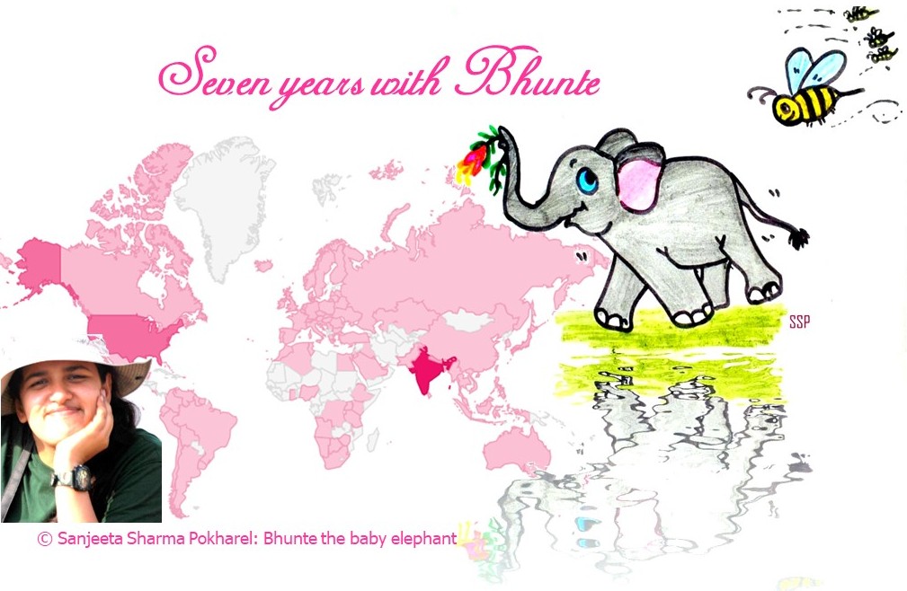 I vividly recollect the moment when I observed a young elephant raising his trunk to smell me, while his sister stood next to him. The world of elephants is truly fascinating if you observe them through their lens and especially if you love their young ones. It has been an incredible seven years since I started drawing cartoons of Bhunte and writing stories about him. I used to jot them down on waste papers, boxes, tables, bed sheets, and whatever else I could find. Bhunte’s image is ingrained in my mind to such an extent that I can feel all his emotions. Through Bhunte, I shared some basic elephant science, raised concerns about elephant conservation and management, shared some silly stories, and a lifetime’s worth of elephantine reminiscences. I am proud to call Bhunte my friend, and his story has now reached over 100 countries. Bhunte has become my travel companion and an integral part of my scientific pursuit. You see him now in some of my publications too 🙂 Let’s celebrate Bhunte, and the greatest treasure of mother nature – the elephants! And the fact that we are lucky to observe elephants in the wild! Share what you love about elephants with Bhunte and your first experience of seeing a wild elephant.